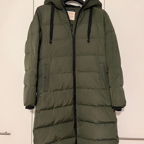Mos Mosh pitkä takki, koko M, valmistettu polyesteristä. Takissa on vihreä väri ja säädettävä vyötärönauha. Oranssit narut antaa kivan kontrastin takkiin.