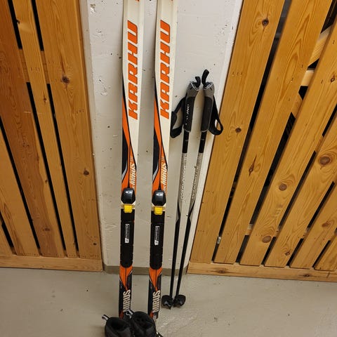 Karhu murtomaasukset 130 cm, sns-siteet. Sauvat 90 cm. Koon 32 sns-monot, sisämitta 19,8 cm. Suksissa pieniä käytön jälkiä, kuten kuvassa näkyvä vaurio suksen päässä.