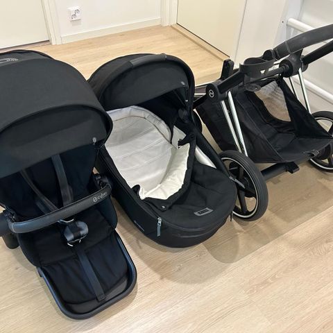 Myydään Cybex e-Priam sähköavusteiset yhdistelmävaunut. Rungon väri ruusukulta ja kankaiden väri musta. Ostettu uutena 2022. Runko, ratasistuin, vaunukoppa ja kankaat hyvässä kunnossa. Työntöaisan nahkaosassa pieni kuluma (näkyy kuvassa). Säilytetty aina sisätiloissa kuivassa ja lämpimässä. Voin laittaa lisäkuvia pyydettäessa.
