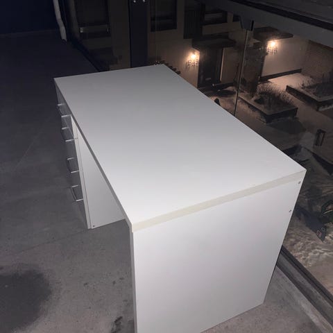Ihan passeli työpöytä. Ollut käytössä ja edessä valkoisessa osassa on kuvan mukaisia jälkiä työtuolista.