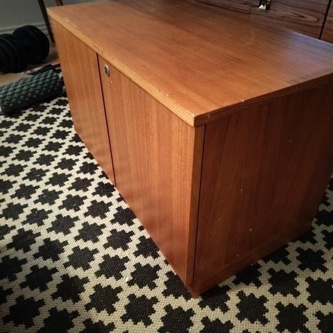 Vintage, teak lipasto. Mustat metalliset jalat. Siisti ja ehjä. Käytönjälkiä, mutta yleisilme siisti. Näitä löytyy kaksi samanlaista.