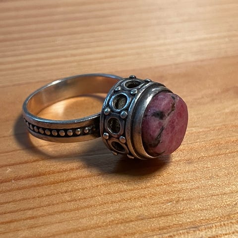 Pronssinen Kalevala sormus, jossa on vihreä graniitti kivi. Börje Rajalinin suunnittelema. Koko 19 mm
