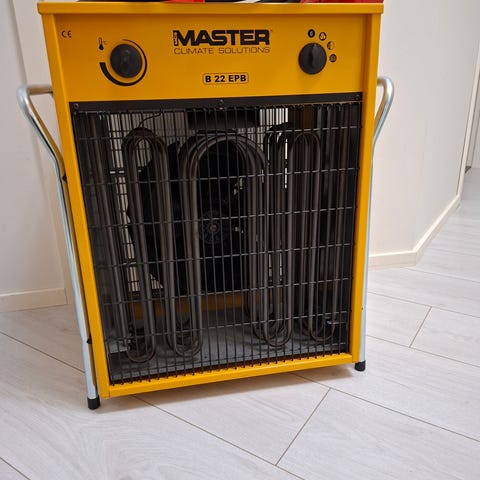 Master BV 170E tehopuhallin, teho 47 kW, väri keltainen. Valmistettu Italiassa. Diesel-käyttöinen laite, sopii tilojen lämmitykseen ja kuivaamiseen. Varustettu pyörillä liikuttelua varten.