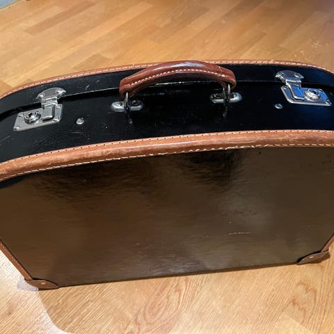 Vanha vanerinen matkalaukku nahkakahvalla
