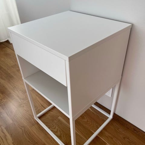Kaksi valkoista pyörillä kätevästi liikuteltavaa yöpöytää, olivat meillä yöpöytinä. Valmistaja ei muistissa, ei ole IKEA. Kunto hyvä, käytön jälkiä.