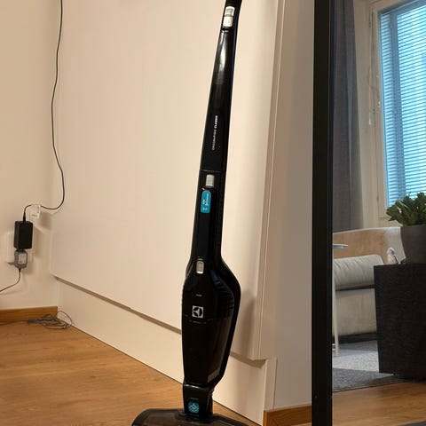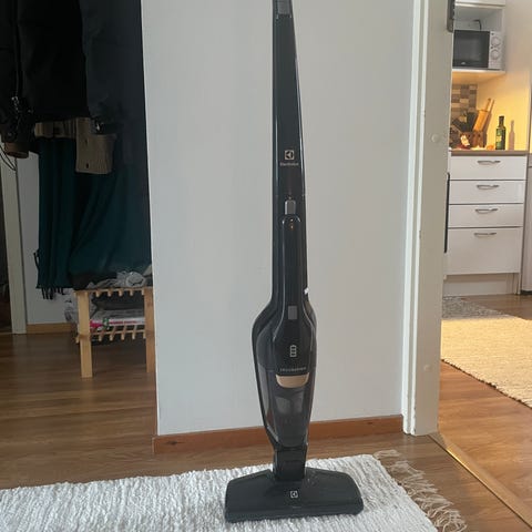 Electrolux Ergorapido 2in1 varsi-imuri ja latausteline. Kaikki toimii niin kuin pitääkin. Ulkoisia käytönjälkiä löytyy, eivät kuitenkaan vaikuta käyttöön millään tavalla. Suodattimet ja muut irtoavat osat on juuri putsattu ja pesty sekä imuri ulkoisesti pyyhitty.