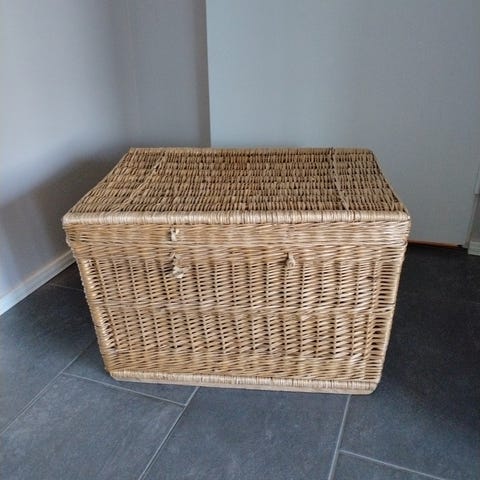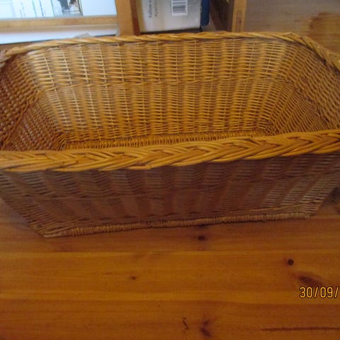 Myynnissä suuri rottinkinen kori jossa kankainen suojapussi. Koko 54 x 44 cm. Nouto Tampereen Lielahdesta.