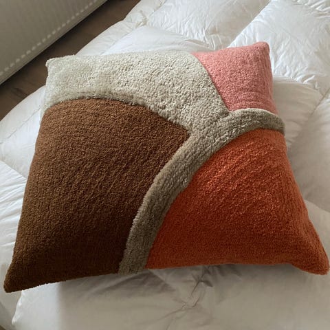 Kankaista valmistettu koristetyyny ja pöytäliina kukkakuvioin