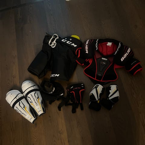 Sisältää CCM polvisuojat sekä kyynärsuojat, Reebokin munasuojat sekä kaulan viiltosuojan. CCM rintapanssarin ja jääkiekkohousut. Reebokin hanskat.