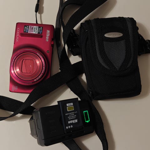Linssi omaan silmään naarmuton. Kameran mukana tulee latauspiuha. Kaupanpäälle myös kameralaukku.