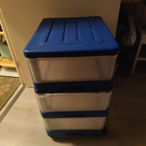 Kuvan mukainen vuodevaatelaatikko renkailla myynnissä. Vastaavanlainen uusi maksaa kohtalaisen paljon.