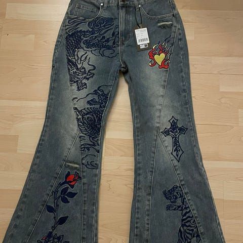 Hyväkuntoiset Ed Hardyn farkut. Ostettu Torista käytettynä, mutta laitan takaisin myyntiin, sillä olivatkin minulle liian isot. Vastaa ehkä ennemmin kokoa M.