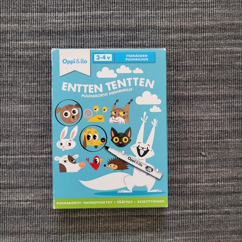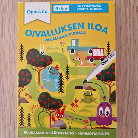 Hyväkuntoiset Oppi&ilo Oivalluksen iloa-puuhakortit, 4-6 v. Kaikki kortit tallessa mutta tussi puuttuu.