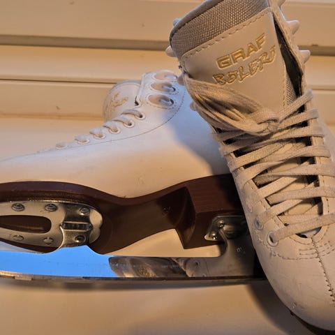 Myydään hyväkuntoiset taitoluistimet Graf Bolero kokoa 35, pohjallisen mitta 22,8cm. Luisteltu hallissa ja ulkojäällä. Terät tarvitsee teroituksen, tällä kaudella ei ole näillä luisteltu. Luistimen kärki ja alaosa ollut suojateipillä suojatut.