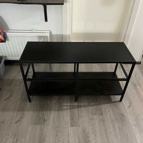 Ikea VITTSJÖ- sarjan musta Tv-taso. Ehjä ja tukeva, ei moitteita kunnossa. Alin levy ollut ruuvattuna kiinni runkoon, josta ruuvien reiät jääneet (viimeinen kuva).