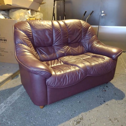 Ehyt ja siisti sini-harmaa kahden istuttava nahkasohva.