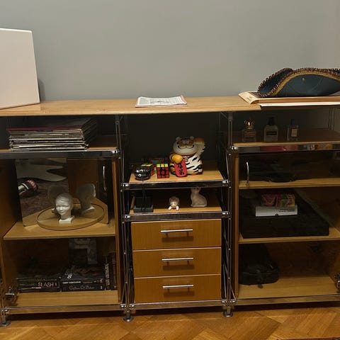 6kpl hyväkuntoista keskilattiakalustetta pyörillä. Lev. 135cm. Kork. 149cm. Syv. 60cm. Sisältää etu-ja sivunäyttötangot kaksipuoleisiin telineisiin. Tarjoa!