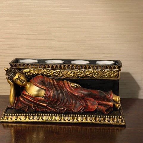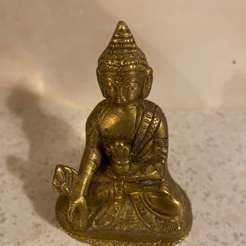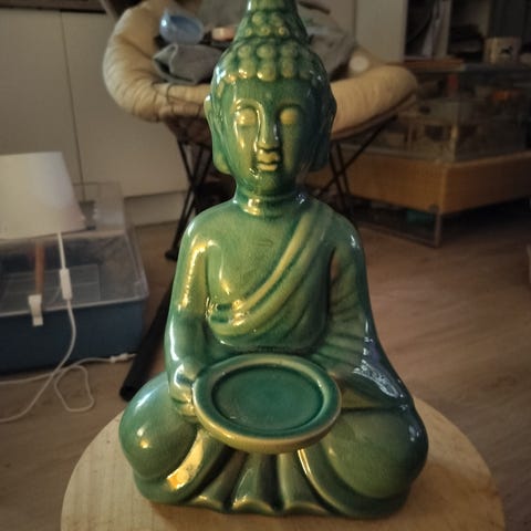 Indiskasta hankittu turkoosi buddha patsas. Ollut parvekkeella käytössä.