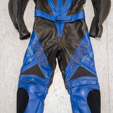 Sweep yksiosainen nahkapuku, koko 48, polvipalat lopussa. Ei repeämiä missään. Jos ei summa miellytä, Tarjoa.
