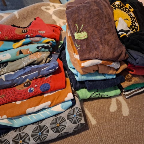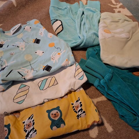 Kuvan vaatteet, koko 86/92. Käytetyt, ehjät ja pestyt. Merkki: Nosh. Yhteshinta. Postitus tai kontaktiton nouto mahollinen. Koira talossa.