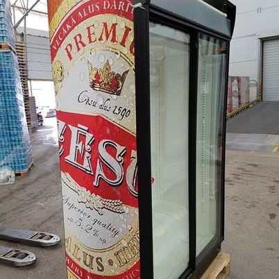 Korkea lasiovella varustettu käytetty Helkama C15 kylmäkaappi. Mitat: korkeus 2062 leveys 600 ja syvyys 710 mm. Puhdistettu ja huollettu. Lämpötila +4 - +10 C. Sisään mahtuu 650 kpl 0,33 l tölkkejä. 4 lankahyllyä. Kylkiteipit vaihtelevat.