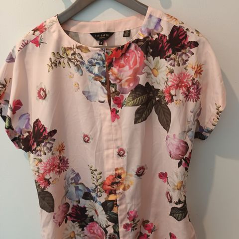 Ohit trikoopaita merkiltä Ted Baker. Hennon roosa pohjaväri, kukkakuviot. Kokomerkintä 3, reilu: kai-kai n.55cm ja olka-helma n.65 cm.