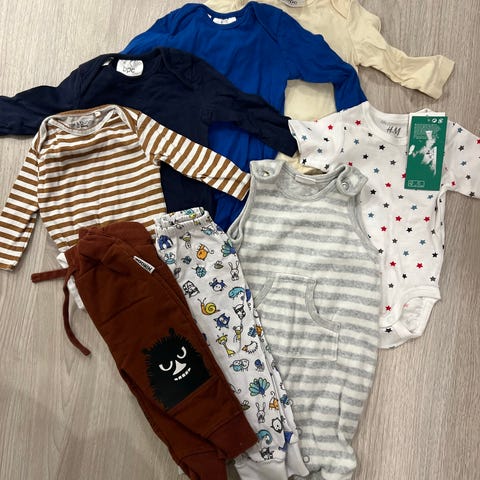 Myydään vaatesetti, johon kuuluvat Polarn O. Pyret -merkkiset legginssit, Lindex-merkkiset housut ja Lindex-merkkinen pitkähihainen body.