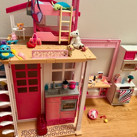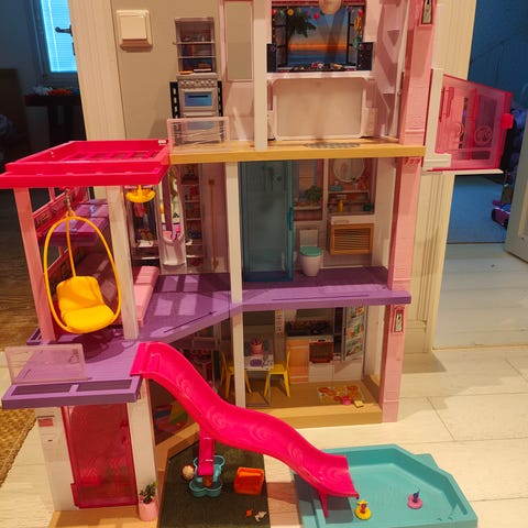 Barbie lasten leikkitalo, jossa on useita kerroksia ja erilaisia tiloja leikkiin. Leikkitalossa on liukumäki, uima-allas johon voi laittaa vettä, parveke ja kalustettuja huoneita, kuten olohuone ja keittiö.