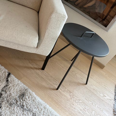 Siistissä kunnossa oleva ruskea sivupöytä.
