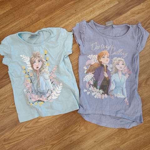 Tyttöjen siisti paitasetti. 2 x H&M Frozen T-paita 1222/128 cm, 1 x Keiki 116 cm t-paita, 1 x Sinsay hapsu t-paita/toppi 122 cm. 5€ spk.