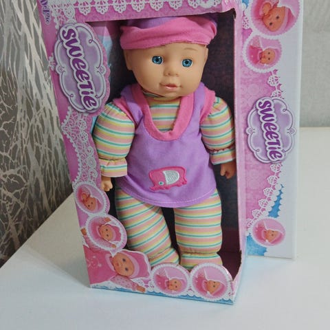 Pehmeävartaloinen interaktiivinen nukke. Koko 43cm. Silmät sulkeutuvat makuuasennossa, nukke ääntelee ja itkee sekä imeskelee tuttia aidon kuuloisesti. Nukahtaessaan hengittää syvään.