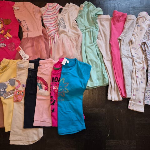 Iso vaatesetti koossa 90-104. Vaatteet ovat hyvässä käytetyssä kunnossa, mutta myös käytön jälkiä on nähtävissä osassa vaatteista. Värit ovat voineet haalistua, kuvissa voi olla halkeamaa, muutamassa vaatteessa oli pieni reikä. Osa vaatteista on vähän käytettyjä ja siistejä.