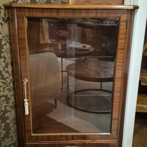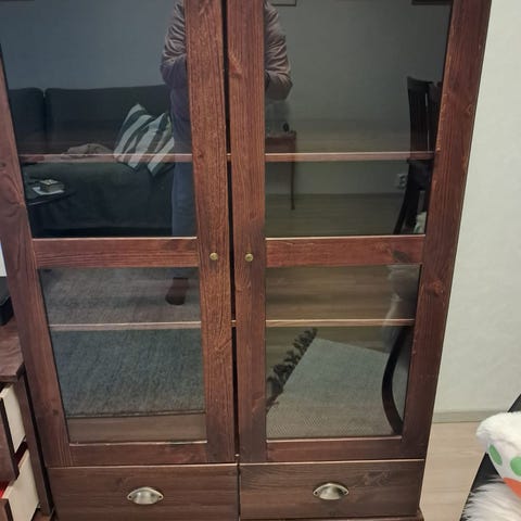 Kaapissa viisi hyllyä, joista kolme näkyvissä lasin takana. Ovilasi fasadihiottu, hyllyt ja sisusta maalattu. Viat: halkeamat sivuilla, ovi jää hieman raolleen alaosasta ja alahyllyt kaipaavat ehkä vähän maalia. (Kts. kuvat). Ovi on painava ollessaan auki eli seinään kiinnittäminen estää kaapin kaatumisen. Meillä on ollut kiinnittämättä, koska kaappi toimi nukkekotina. Ovea ei paljoa availtu eikä vioista ole siinä tarkoituksessa ollut haittaa.