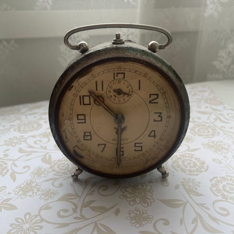 Vanha 1800-luvulta oleva herätyskello, jossa on kellotaulu roomalaisilla numeroilla. Kello on varustettu kahdella pienellä jalalla ja yläosassa on kellon soitin. Kello on hopeanvärinen ja sen rakenne on pyöreä.