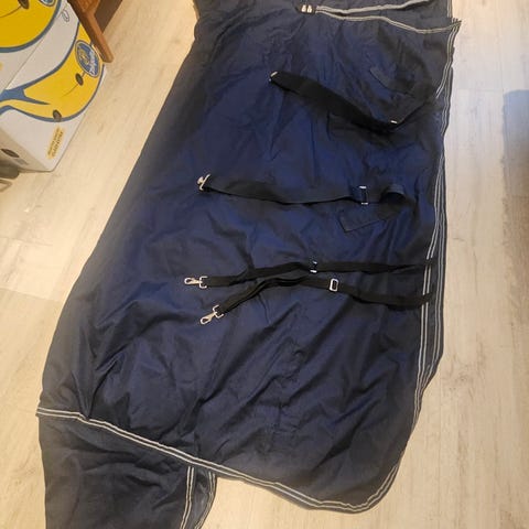 N. 200g täyte, kiinteä kaulakappale. Ehjä, mutta vaatii pesun. Voin kuvata likakohdat, pari kertaa päällä viime pesun jälkeen.