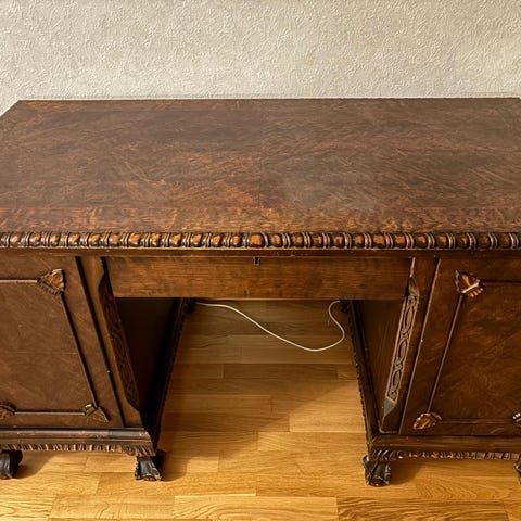 Vanha puinen painava kirjoituspöytä. Ehjä, ihan ok siistissä kunnossa ikäisekseen. Avainta ei ole.