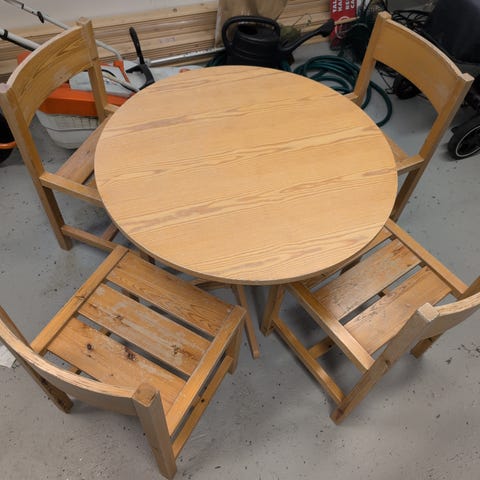 Pyöreä ruokailuryhmä jatkopalalla ja neljällä tuolilla. Yhdessä tuolissa läikkä, kuvassa vasemmalla.