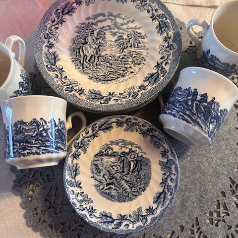 Royal Copenhagen Christineholm Sigvard Bernadotte 2000 lautaset, joissa on sininen reuna ja koristeellinen kuviointi. Astiat ovat valmistettu posliinista ja soveltuvat ruokailukäyttöön.