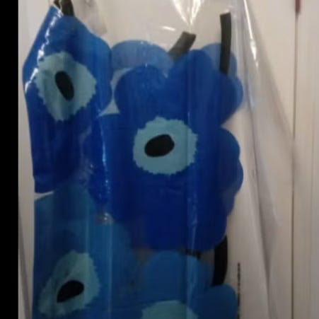 MARIMEKKO "UNIKKO" suihkuverho noin 180 X 200 . Ryhdikästä muovia.