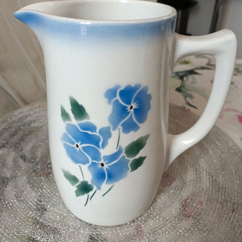 Thure Öbergin suunnittelema iso kannu. Etupuolella sini-vihreä perhos-aihe.