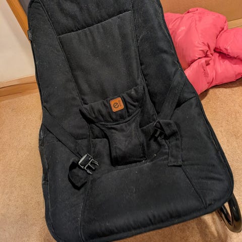 Siisti Emma-merkkinen sitteri lelukaarella. Istuinosa ja selkönoja sädettävissä ja lukittavissa eri asentoihin. Takaosassa olevat jalat saa käännettyä niin, että sitteri keinuu.