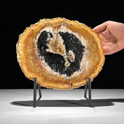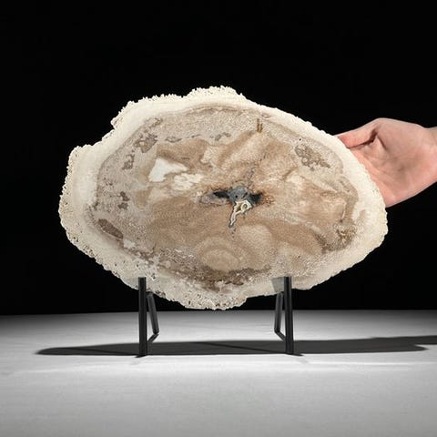 Kaunis viipale fossiilipalmun rungosta, jossa on upeita sävyjä ja tyypillinen puhkeama. Kuori on selvästi näkyvissä ulkopuolella, ja palmujen tyypillinen muodostuma erottuu keskellä. Osan sisäosasta on geodetisesti kiteytynyt. Viipale on erittäin kauniisti kiillottu, mikä tekee yksityiskohdat näkyviksi.