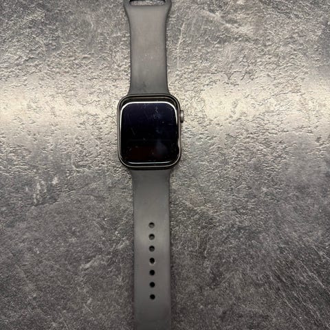 Apple Watch Series 4 älykello, jossa on vaaleanharmaa ranneke. Kello tarjoaa useita älytoimintoja, kuten ajan näyttämisen ja akun latauksen tilan seurannan. alle vuoden ollut käytössä ei naarmuja