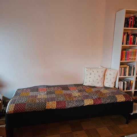 Vaalea beige Asko Bonnell -sänky ja patja. Todella hyvä nukkua! Ei liian pehmeä, mutta ei liian kovakaan.