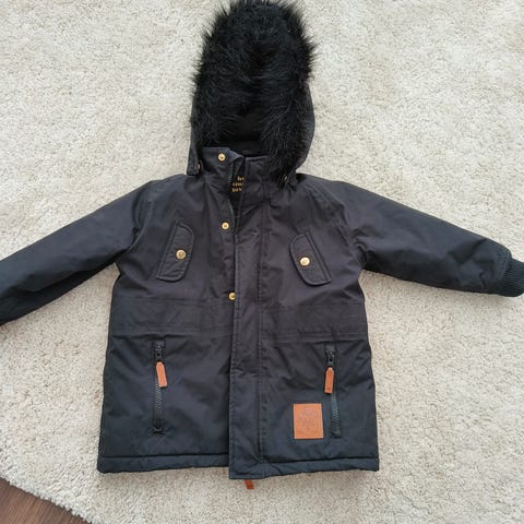Mini Rodini muhkea toppatakki, koko 104/110. Yleisilme edelleen ok, mutta paljon käytetty ja muutamia moitteita löytyy. Paikoitellen pientä likaa, hihansuulla kulumaa ja vetoketjulistan takaa paikattu, tämä ei näy ulospäin, vetoketju jäi jumiin kankaaseen ja nirhauma siitä paikattu. Edelleen super lämmin ja ihana takki. Hylkii vettä