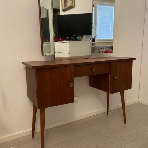 Tyylikäs 50/60-luvun kampauspöytä myytävänä. Suunnittelija Kurt Hvitsjö. Peili ehjä ja irroitettava. Yleiskunto ikäisekseen hyvä. Jaloissa ja kannessa pientä jälkeä. Vetolaatikot toimivat. Sisustassa jälkiä. Ei hajuja. Runko kaikin puolin tukeva.