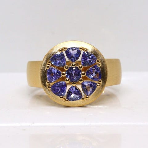 Tarjolla hopeasormus 925, jossa on monipuolisia luonnon jalokiviä, tanzanite ja timantteja.