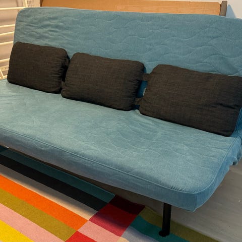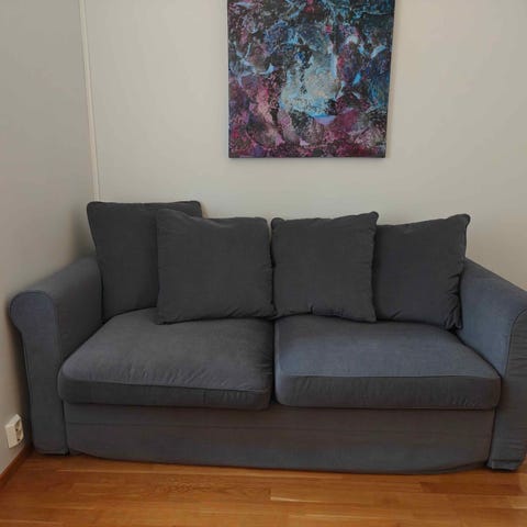 Ikean Grönlid vuodesohva divaanilla. Vuode nostetaan sohvan sisältä, patja kuuluu sohvaan ja kaupan päälle saa vielä vain paristi nukutun petauspatjan. Hyvä istua ja reilu istuinsyvyys.