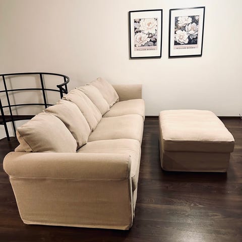 Kuvassa sohvanojien päälliset eivät ole paikallaan, ovat tiukat laittaa, ovat saattaneet kutistua hieman pesussa. Divaanin päällisen reunat hieman revenneet juuri tämän takia. Kuvasta puuttuu yksi sohvatyyny vielä, siinä valkoinen päällinen.