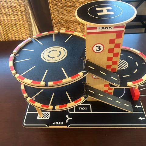 Autotalo puusta ja muovista. Iso ja kestävä. Kunto kohtalainen, sillä oransseja aitoja puuttuu ja hissistä on kadonnut naru.